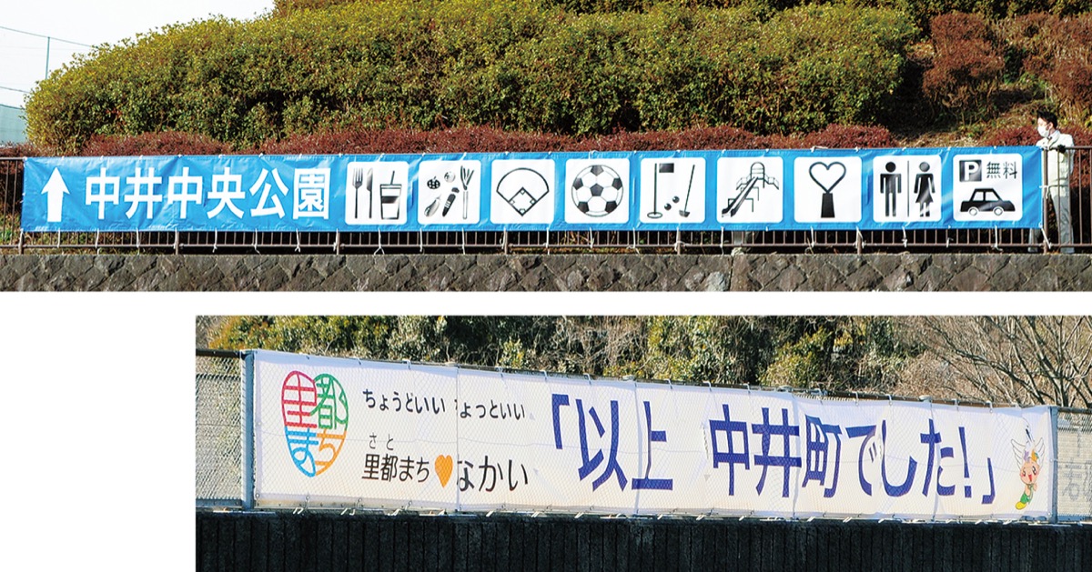 町はシティプロモーションの一環として、横断幕と懸垂幕の掲出を2017年から始めた。幕のメッセージには「ちょうどいい ちょっといい 里都まち♡なかい」「活力・快適・安心チャージ中!」などがある。今年度開催したワークショップ「なかいファンミーティング」で町民が出したアイデアを基にメッセージとデザインを決定し、3枚の幕をリニューアルした。「町民の想いが込められた幕で中井町の魅力を発信し、さらに浸透させていきたい」と町の担当者は話す。