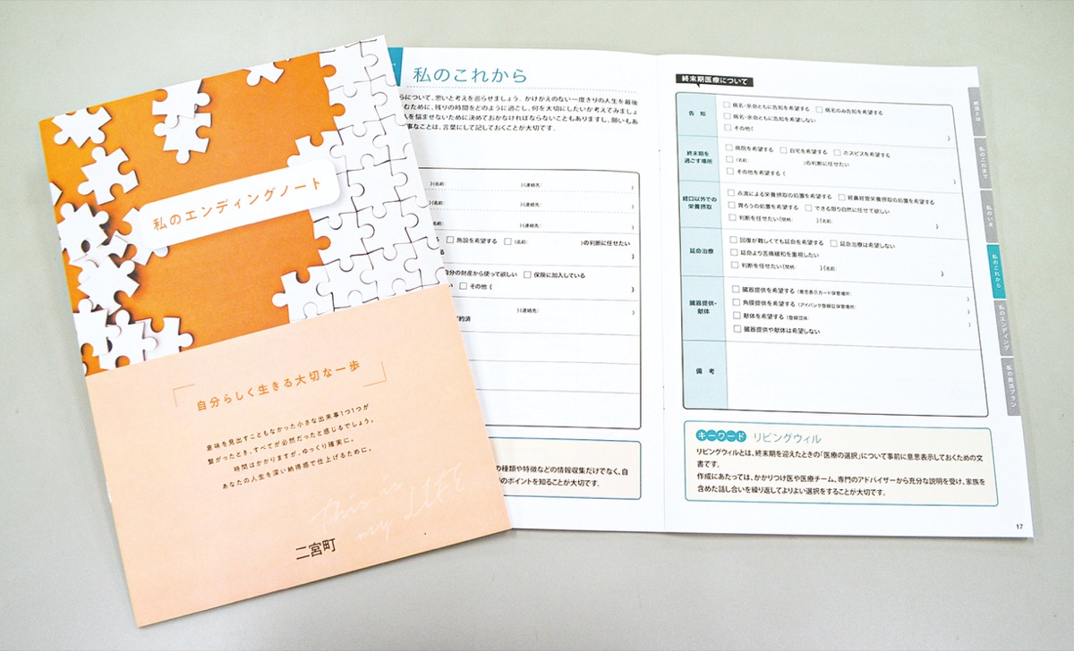 残りの人生を自分らしく充実して生きるための「終活」に役立ててもらおうと、二宮町が「私のエンディングノート」を作成し、無料配布を始めた。出生からこれまでの歩みを振り返り、人生の総仕上げにやっておきたいことや必要なことを整理できるようサポートする冊子。介護や終末期医療、葬儀などに関する希望だけでなく、公的な証書やカード、資産、大切な品物の情報を書き留めておくことで、家族や周りの人の負担軽減につなげる役割も持つ。
