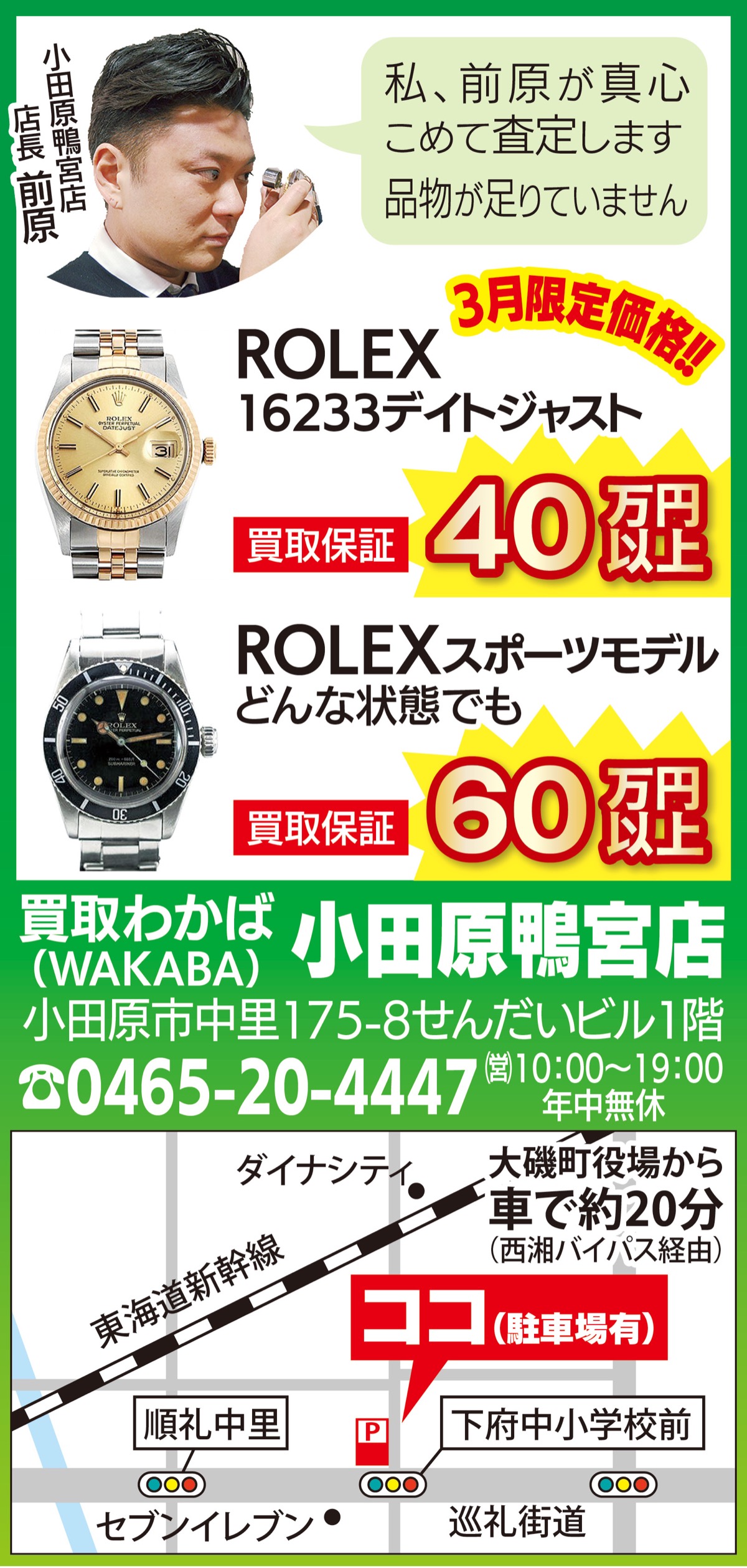腕時計に関しては、腕が出る夏場に向け需要が高まるため、それを見越して現時点での最高価格よりも高価買取できることもあるという。保証書や付属品がなくても同額で買い取ってくれるキャンペーン中。大切な品物だからこそ、損しないためにも「買取わかば小田原鴨宮店」にお願いしてみてはどうだろうか。