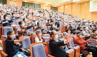 二宮町の高齢者が講義を受ける「おじいちゃん・おばあちゃん大学」がラディアンホールで5月21日に開かれ、約250人が交通安全について学んだ。奉仕団体の二宮ライオンズクラブが設立時から実施している独自事業で53回目。新型コロナウイルスの影響で3年ぶりの開催となった。