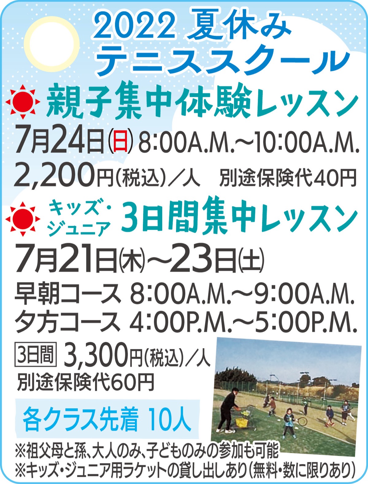 キッズ・ジュニアの初心・初級者は「3日間集中レッスン」へ。7月21日(木)〜23日(土)の【1】早朝(午前8時〜9時)と【2】夕方(午後4時〜5時)から選べて、1人3300円(税込・別途保険代60円)で3日間通える。