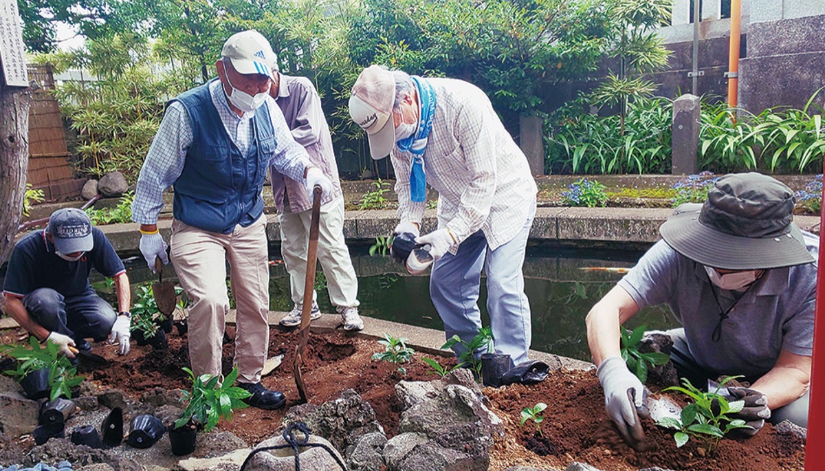 大磯町の六所神社(柳田直継宮司)で6月18日、前・宮総代の鈴木馨さんら役員が、縁起木としてお正月飾りなどにも使用される千両と万両を境内にある2つの池に浮かぶ島に植えた。