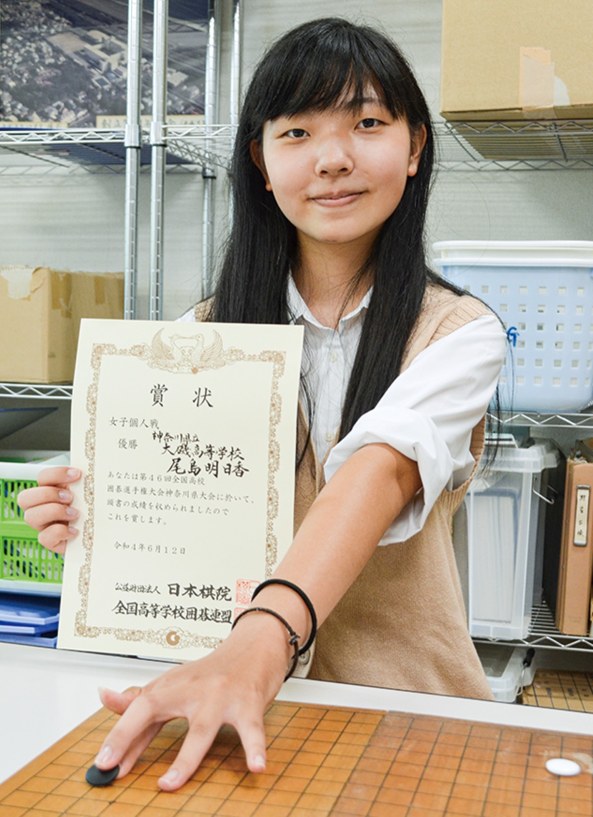 県立大磯高等学校2年生の尾島明日香さん(16)が2つの県大会で優勝し、8月に開催される第46回全国高等学校総合文化祭の囲碁部門と、第46回文部科学大臣杯全国高校囲碁選手権大会に出場する。