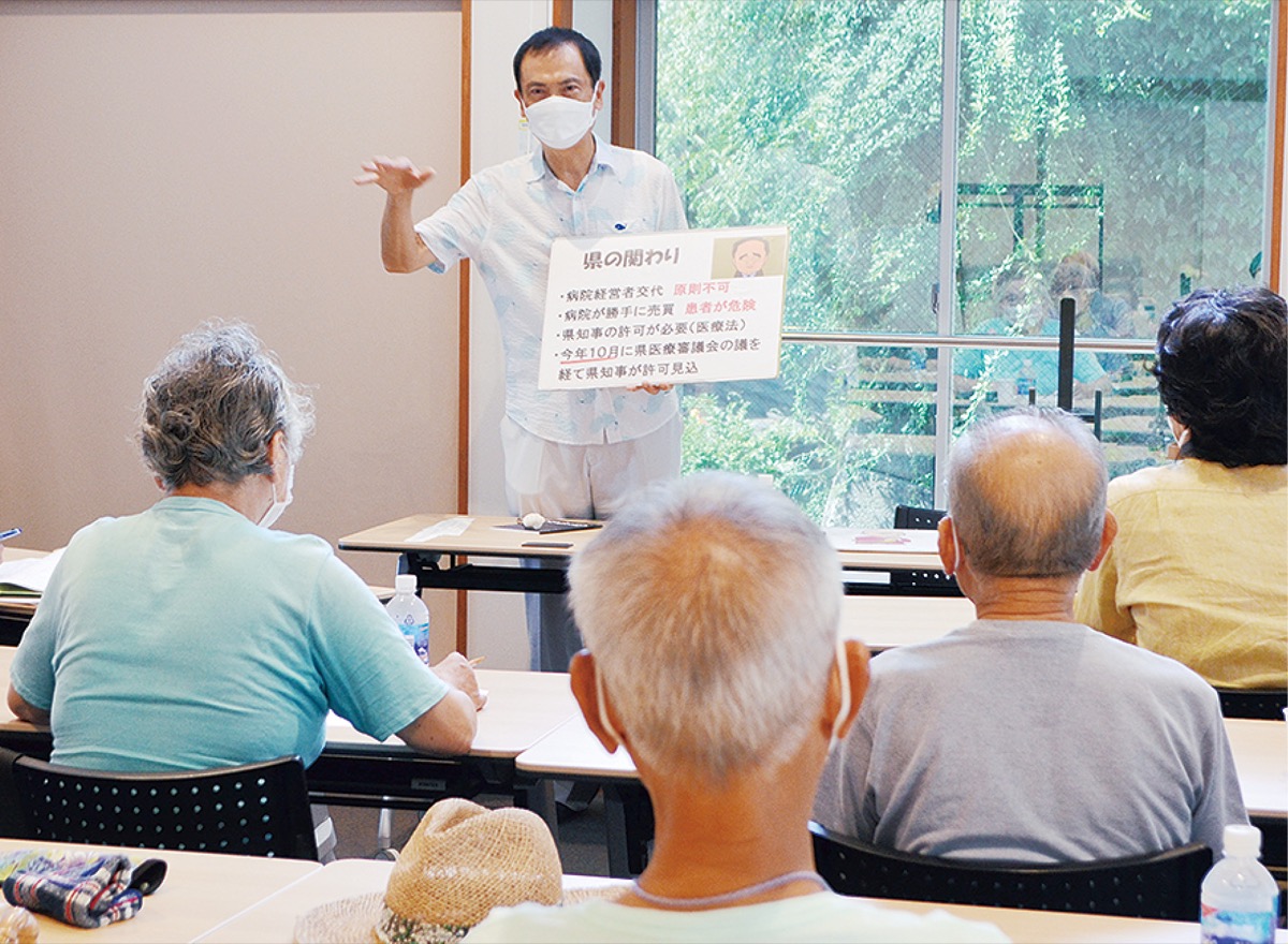 来年3月に東海大学から医療法人徳洲会へ経営移譲が行われる大磯病院についても、その経緯や準備状況などを解説。徳洲会グループの規模や経営理念、新病院になっても現行の診療科・病床数は維持され、患者のカルテも引き継がれる見通しであること、病院経営者の交代に必要な県知事の特別な許可が医療審議会で近く許可される見込みであることなどを伝えた。また要望の多い産婦人科の設置や、バス運行に関わる町道の整備などの課題解決には町の支援体制が必要とも語った。参加者から地域の課題や要望の聞き取りも行い「しっかりと受け止め前へ進めていく」と応えた。次回は9月17日(土)に大磯町の台町と山王町で開かれる。