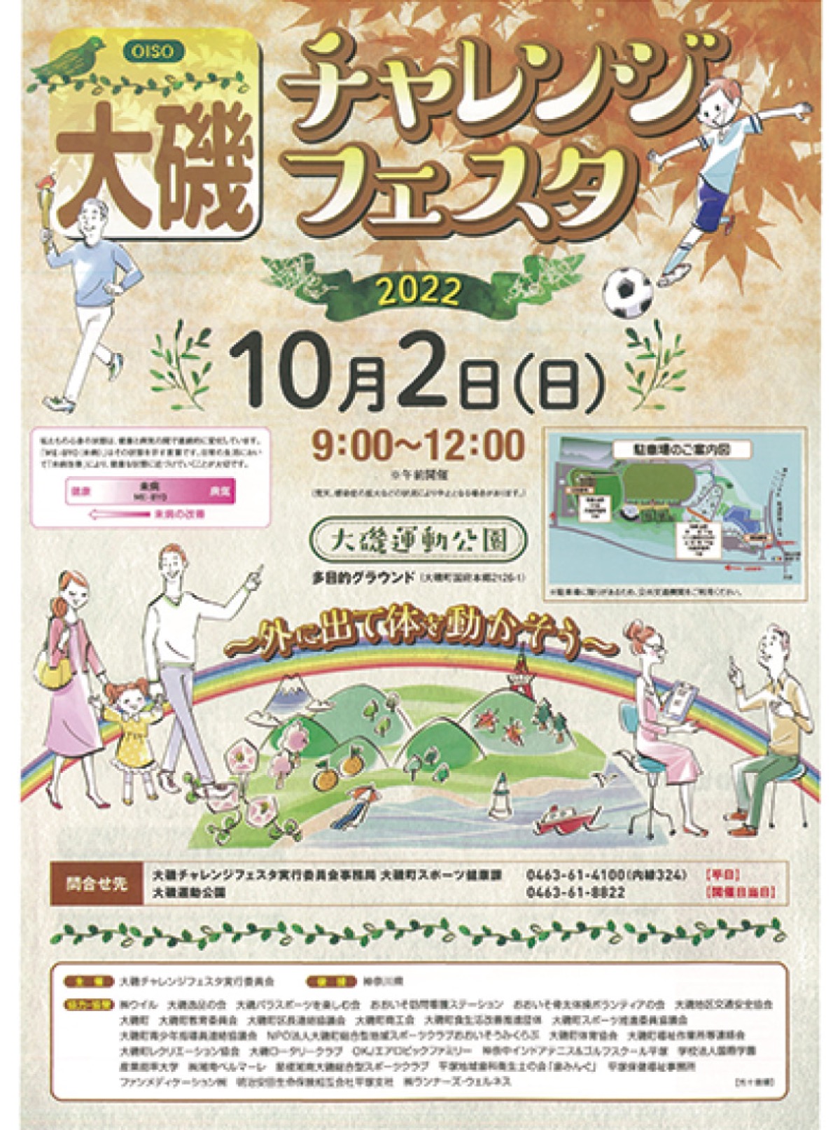 健康増進や未病改善を目的に、様々な運動やレクリエーションが楽しめるスポーツイベント「大磯チャレンジフェスタ」が、10月2日(日)に大磯運動公園で開催される。午前9時から正午まで。