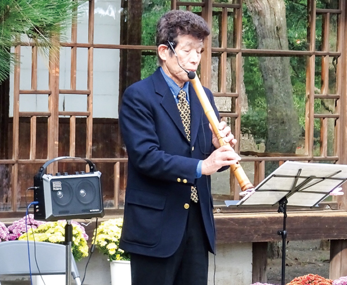 午前11時から正午まで。古典邦楽から歌謡曲、アニメソング、ジャズなど多様な楽曲を演奏する。また、園内には期間限定でざる菊が飾られ、「演奏とともに花を楽しんで」と同園職員。