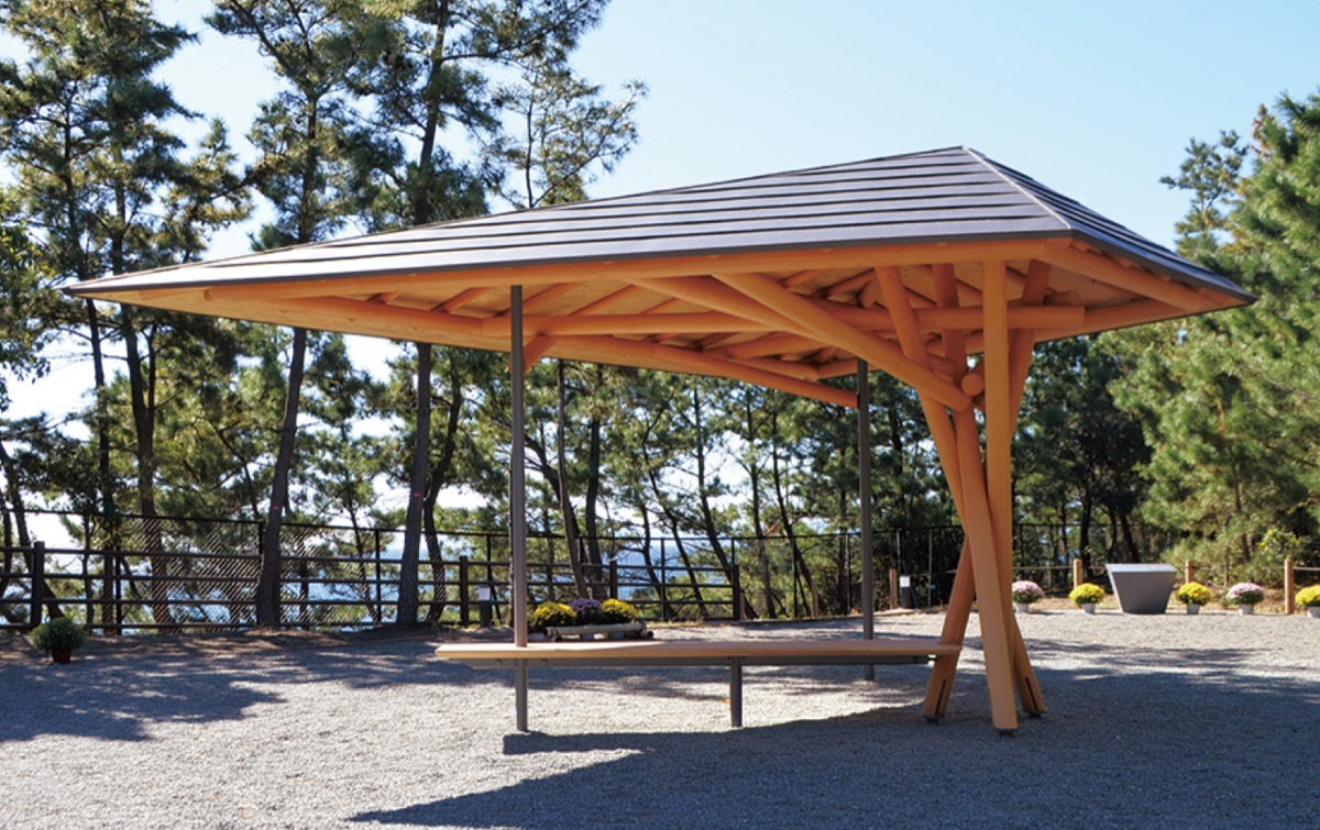 緑地内には、海を眺めながらゆっくりと休憩できる四阿を設置。設計を担った隈研吾事務所の名城俊樹さんは「海水浴場発祥の地という大磯の歴史からパラソルをイメージした。角度で見え方が変わる面白いデザインになっている」と語り、木材と金属を組み合わせて耐震性も備えていることなどを説明した。また緑地の歴史などが記された真鶴産小松石の記念碑も設置された。