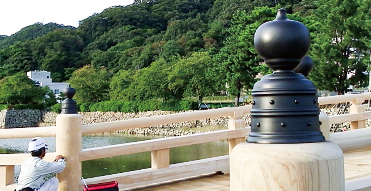 二宮町在住の上島(かみじま)国澄(くにすみ)さん=人物風土記で紹介=が、鳥取県の国指定史跡である鳥取城跡擬宝珠(ぎぼし)橋の復元工事において擬宝珠の制作に協力し、今年8月、日本建設業連合会による「日建連表彰」土木賞の特別賞に選ばれた。長年の鋳物研究で培った技術と知識をもとに江戸時代の色付けを再現し、「モノづくりの原点として伝統技能を生かし、技術の伝承に貢献している」と高く評価された。11月25日には、日建連表彰の式典に登壇する。