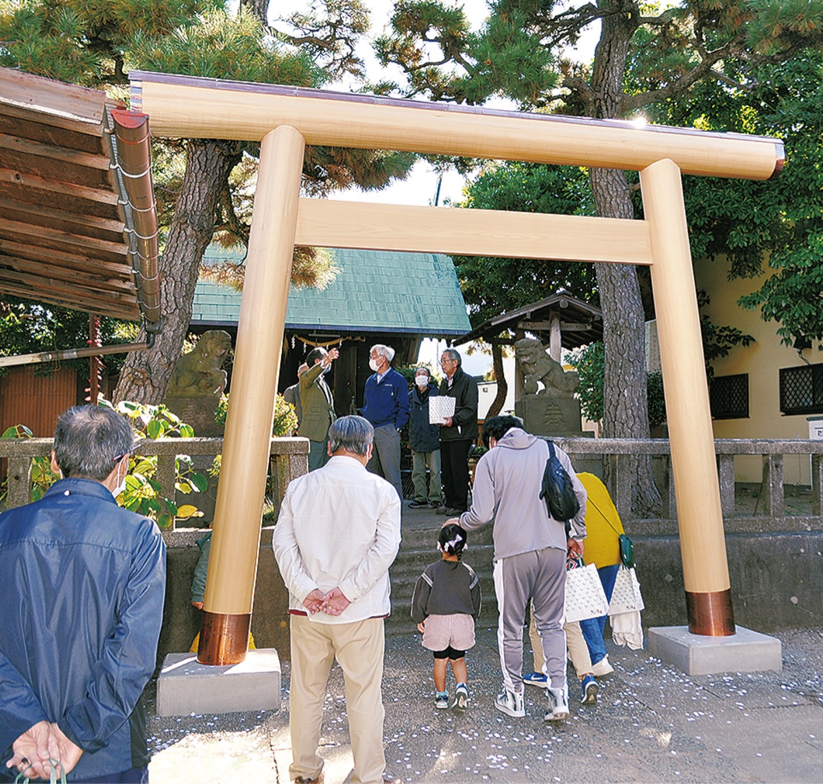 大磯町にある神明神社の鳥居が、地域住民の浄財により20年ぶりに建て替えられた。11月19日に鳥居の奉納奉告祭が催され、氏子や神明町町内会の役員ら約20人の参列者が、新しい鳥居の完成を喜んだ。