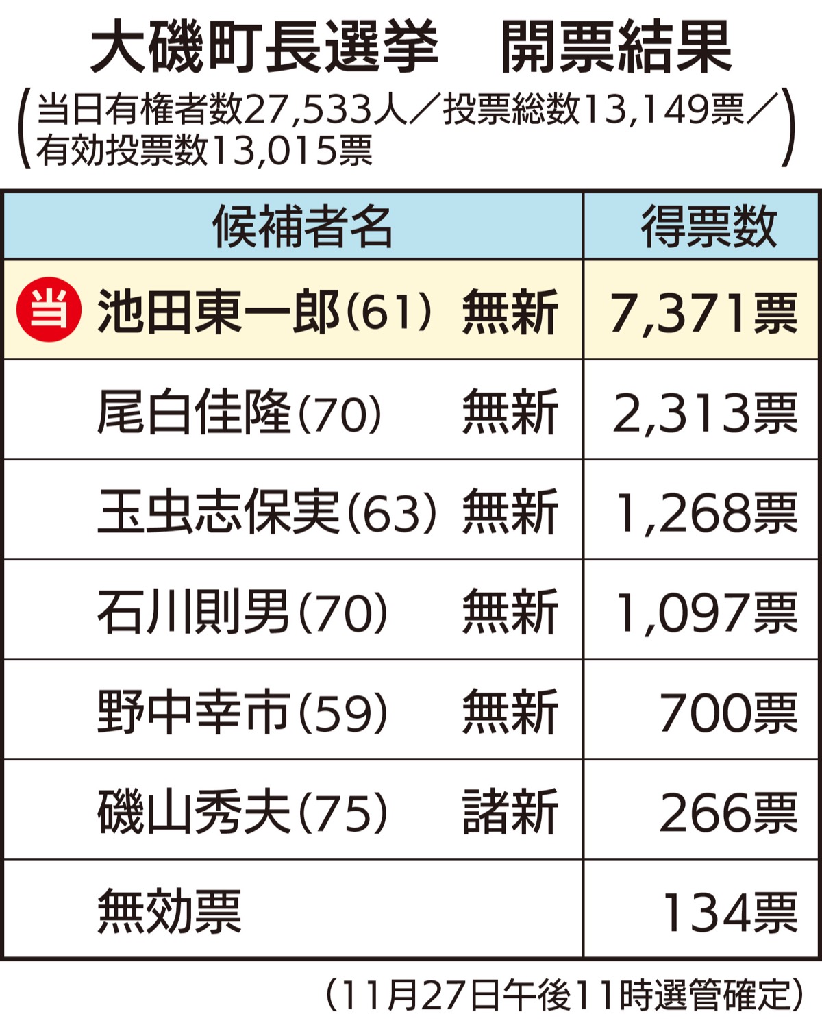 任期満了に伴う大磯町長選挙は11月27日に投開票され、同町史上最多となる6人の立候補者が乱立する混戦を制し、無所属で元県議の池田東一郎氏(61)が初当選を果たした。投票率は過去最低だった前回(2018年)を6・59ポイント上回る47・76%だった。