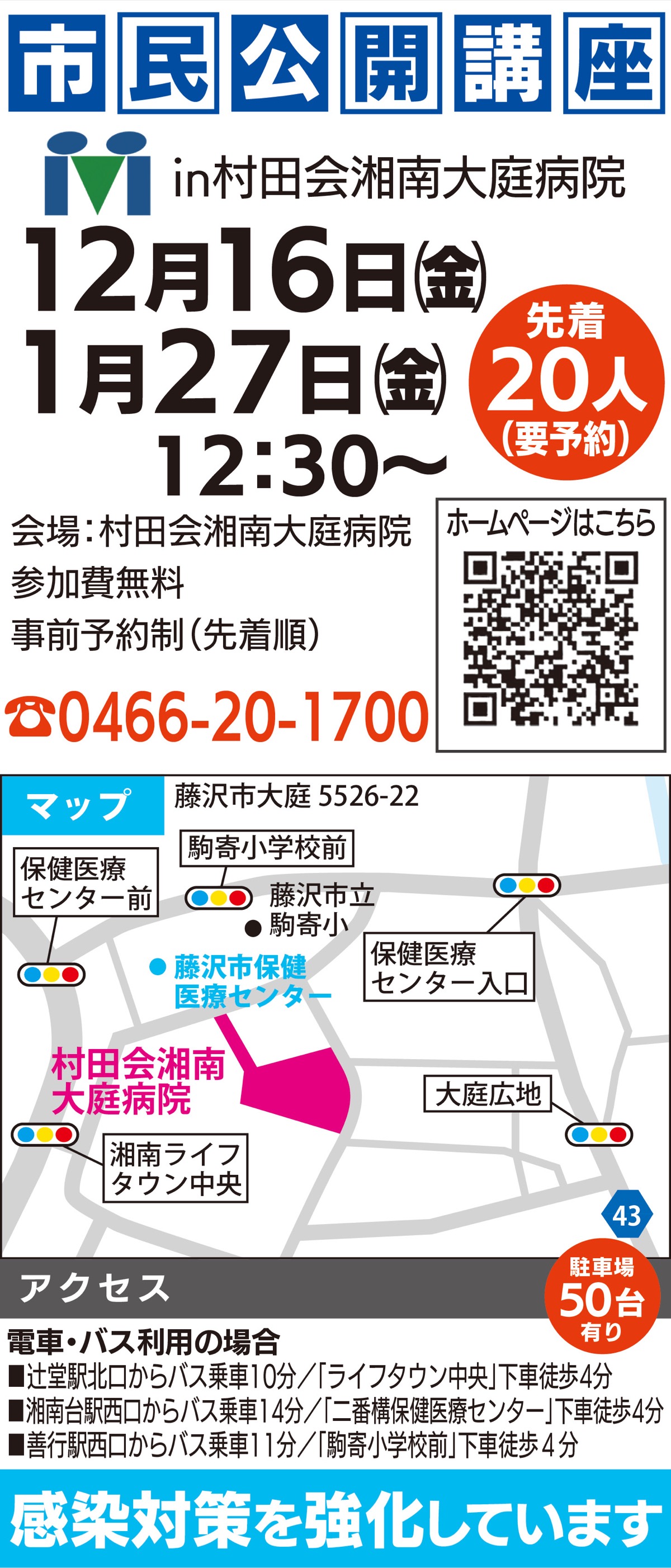 日本人の2人に1人が「がん」と診断される中、近年、注目されている治療法がある。がん細胞が熱に弱いという特性を生かした「がん温熱療法ハイパーサーミア」だ。地域でいち早く導入した村田会湘南大庭病院が12月16日(金)と来年1月27日(金)、同院で無料の市民公開講座を開催する。