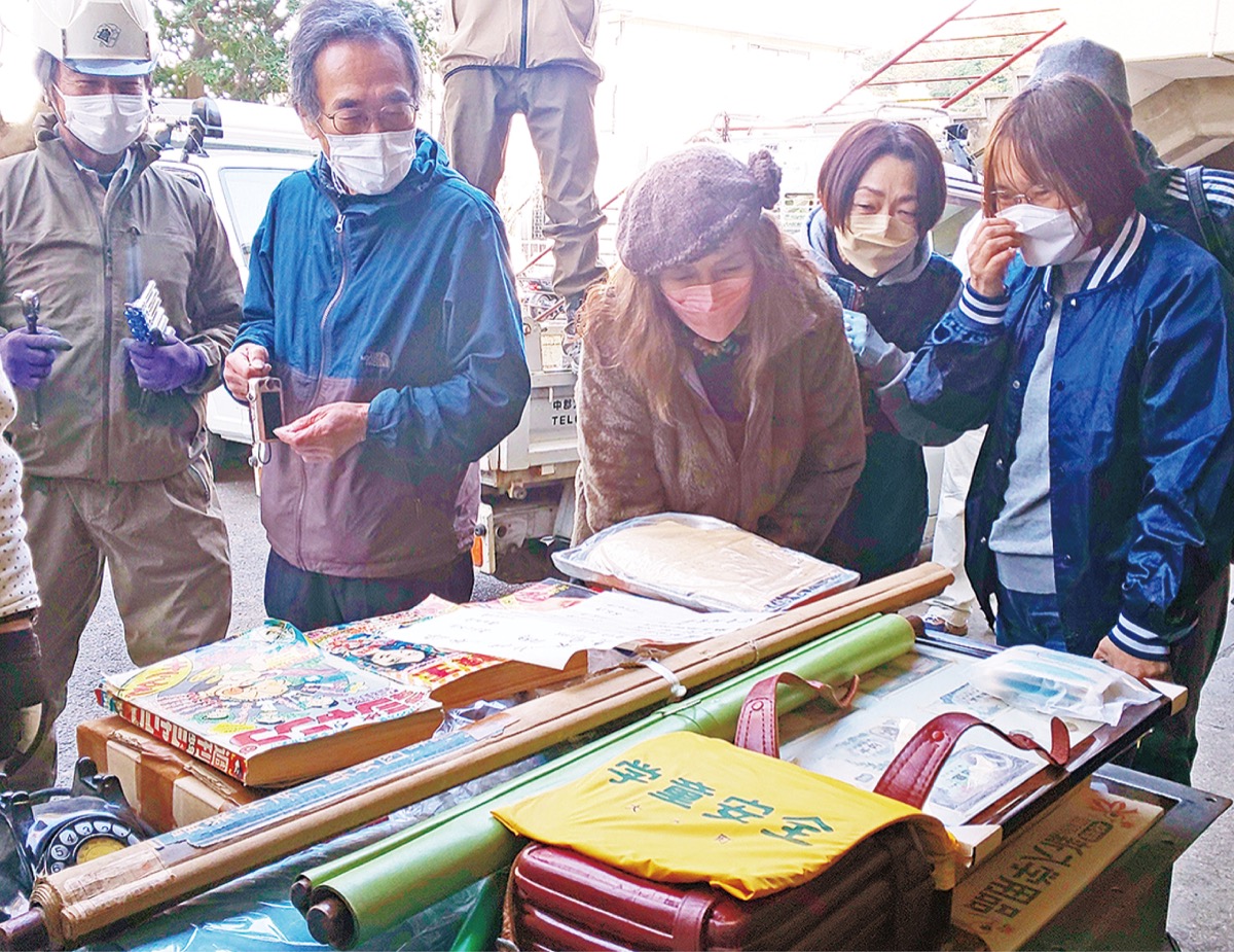 作業では、当時小学6年生だった鈴木盛正さんが社長を務める建設会社の鈴木組=西小磯=が、重機などを使って保存庫を解体。約2時間をかけてステンレス製のタイムカプセルを取り出し、実行委員会のメンバーで開封した。中には、当時の児童が将来の夢や50年後を想像した作文や絵画、集合写真、名前入りのランドセルや教科書、漫画雑誌や週刊誌、黒電話などが収められていて、「五十年前のウイスキーです。御賞味ください」と粋な文句が記された箱もあった。思い出の品々に実行委員会のメンバーらは「懐かしい」「きれいに残っているものだね」と声を弾ませた。