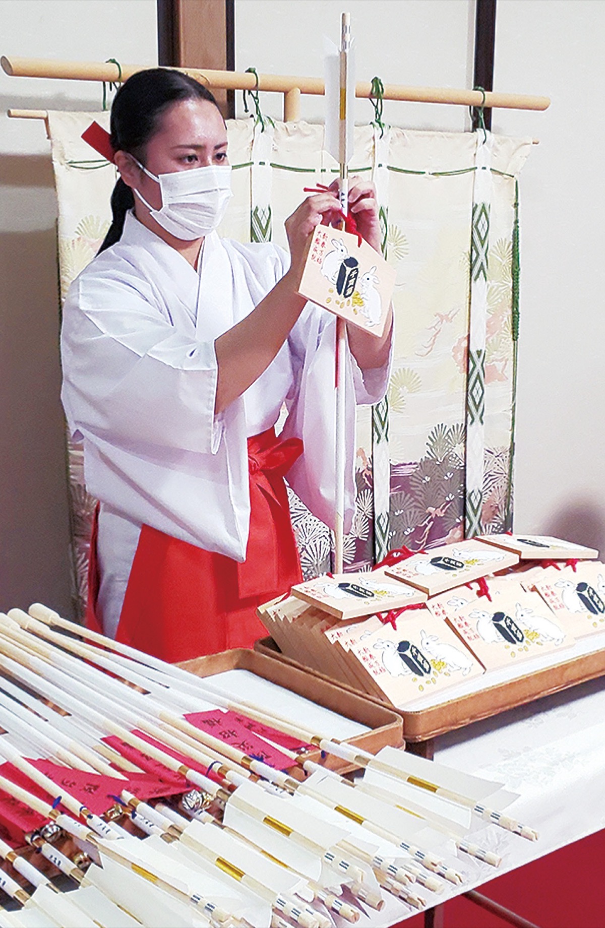 六所神社では初詣の参拝者を迎える巫女の研修が始まり、緋色の袴を身に着けた女性たちが言葉遣いや立ち居振る舞い、神社やお守りに関する知識などについて学んでいる。厄除けや家内安全を願う破魔矢に、来年の十二支の「卯」(ウサギ)が描かれた絵馬を取り付ける作業も行った。