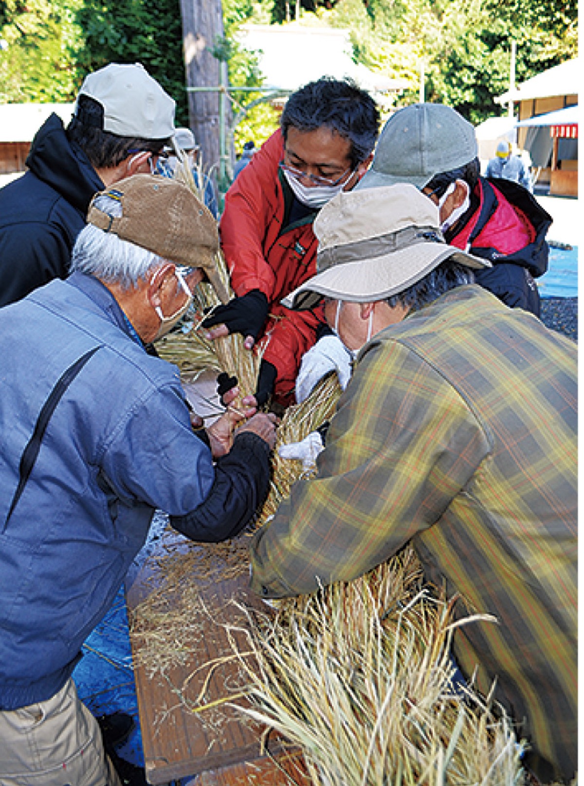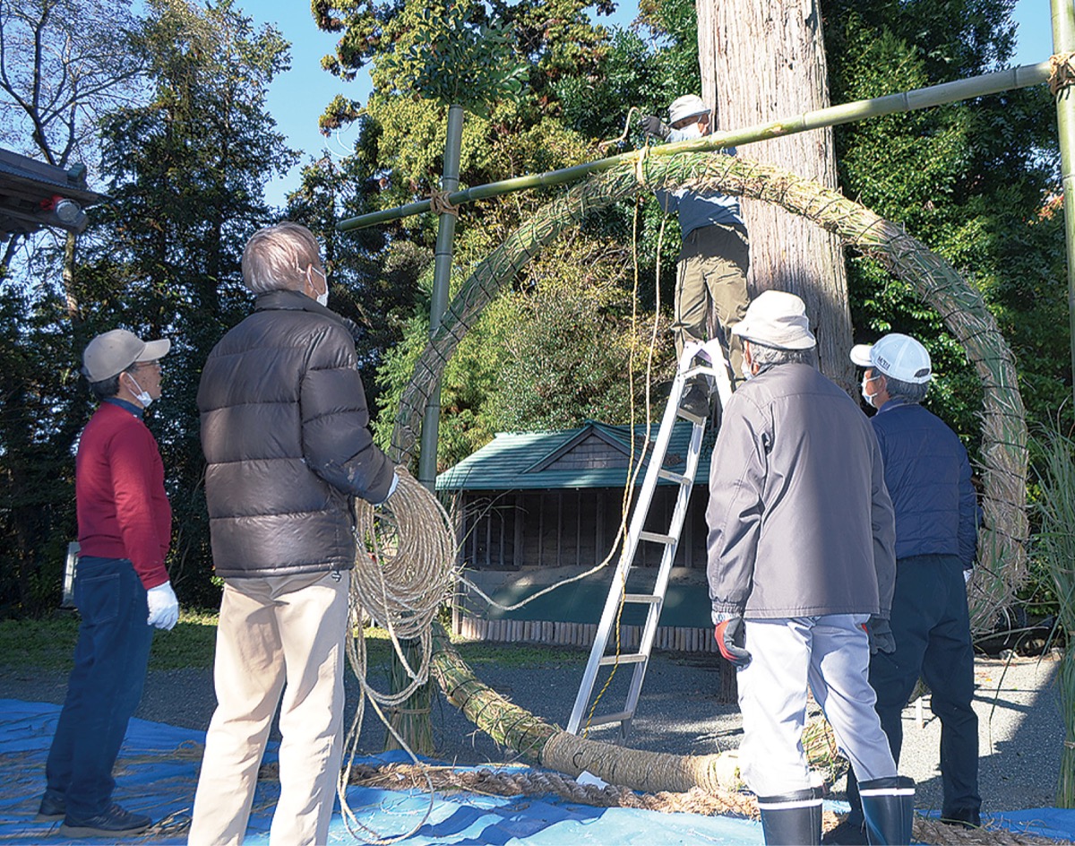 拝殿と御神木のしめ縄の新調、直径約2・5mの茅の輪づくりも行われ、氏子総代長の橘川昭夫さんは「神社を参詣する人のために、しっかりとしたものを作りたい」と作業に取り組んだ。また、この日は元町の八幡神社など3神社の関係者も川勾神社の境内でしめ縄づくりを行い、経験者が指導しながら4〜5人がかりで藁束をよっては継ぎ足していき、手際よく太い縄に編んでいった。