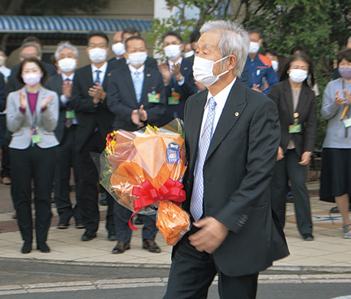 3期12年町長を務めた中崎久雄氏は、14日の退任式で見送りに集った職員らに感謝を述べ「この12年間、皆さんの力で町の様々な課題を解決し、方向性を示すことができた。ここで得た人とのつながりを誇りに思い、築いた人脈を今後の町のために使っていけたら」と深々と頭を下げた。