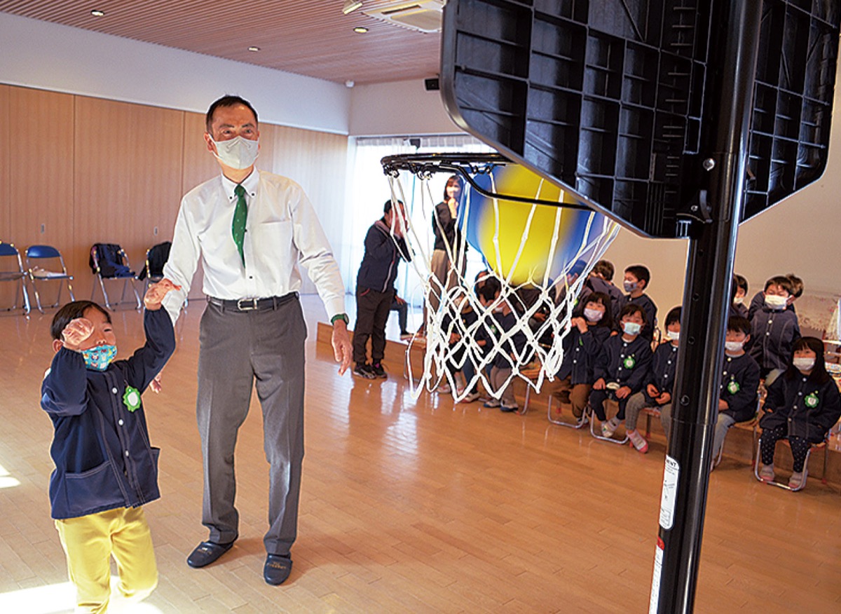 1月25日に大磯町立たかとり幼稚園で贈呈式が催された。同協会の柿沼憲一会長が「先生の言うことを聞いて仲良く遊んで。みんなの成長を願っています」と述べ、池田東一郎町長も「バスケは頭も体も使うスポーツ。毎日遊んだら八村塁選手のようになれるかも」と園児らに呼びかけた。