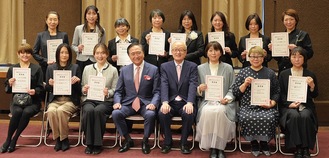女性が開発に貢献した優れた商品やアイデアを県が認定する「神奈川なでしこブランド」の2022年度認定商品に、大磯町商工会女性部が中心となって開発したミカンアロマオイル「大磯 frais ―Tekka―」(オオイソ フレ テッカ)が選ばれた。2月3日に県庁で認定式が行われ、高橋みどり部長が黒岩祐治県知事から認定証を受け取った。