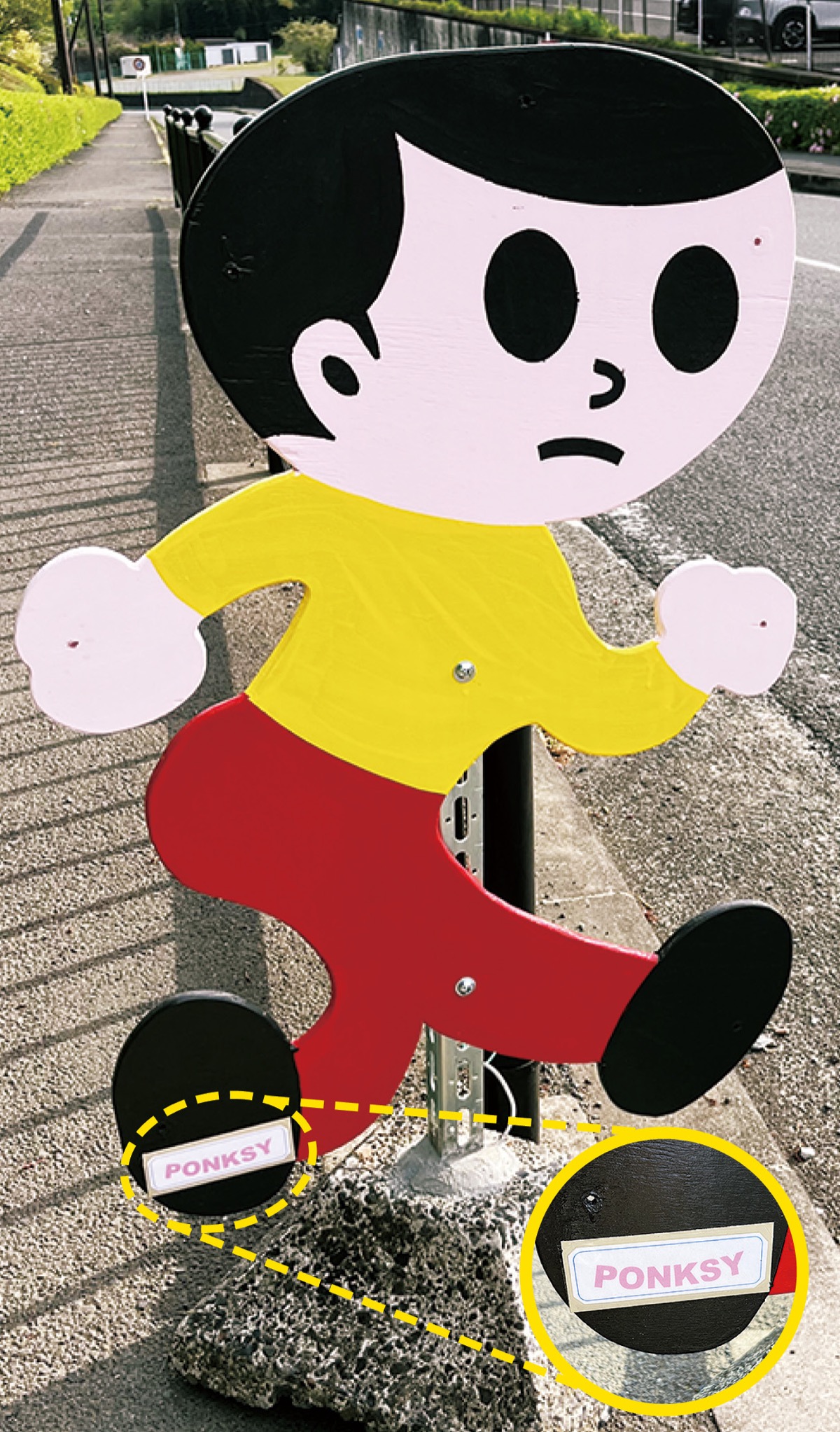 素性不明のアーティスト・バンクシーならぬ「ポンクシー」の名前が書かれた「飛び出し坊や」が中井町立中村小学校と井ノ口小学校周辺、中井中央公園に設置されている。