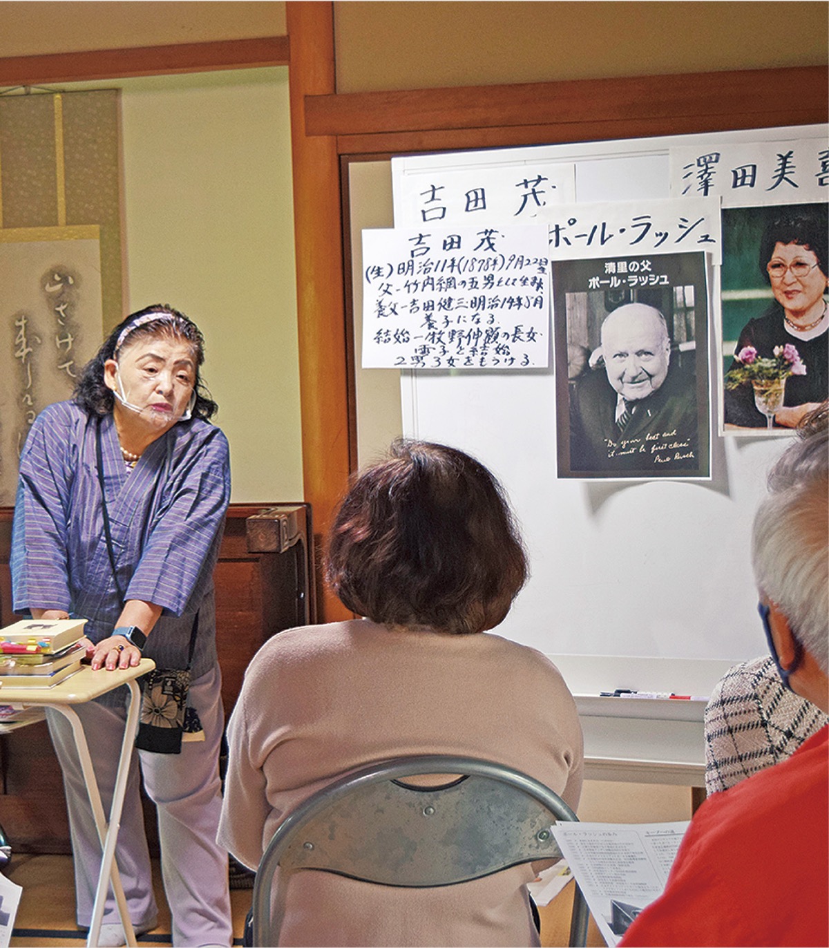 当日のテーマは「太平洋戦争以後の日本の平和に動いた人達 吉田茂・ポールラッシュ・澤田美喜を語る」。武井さんは、「今の社会情勢の中でこそ、戦後の平和を築いた3人を紹介したい」と説明。