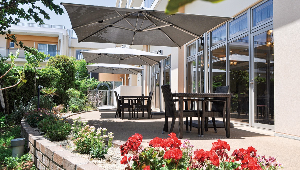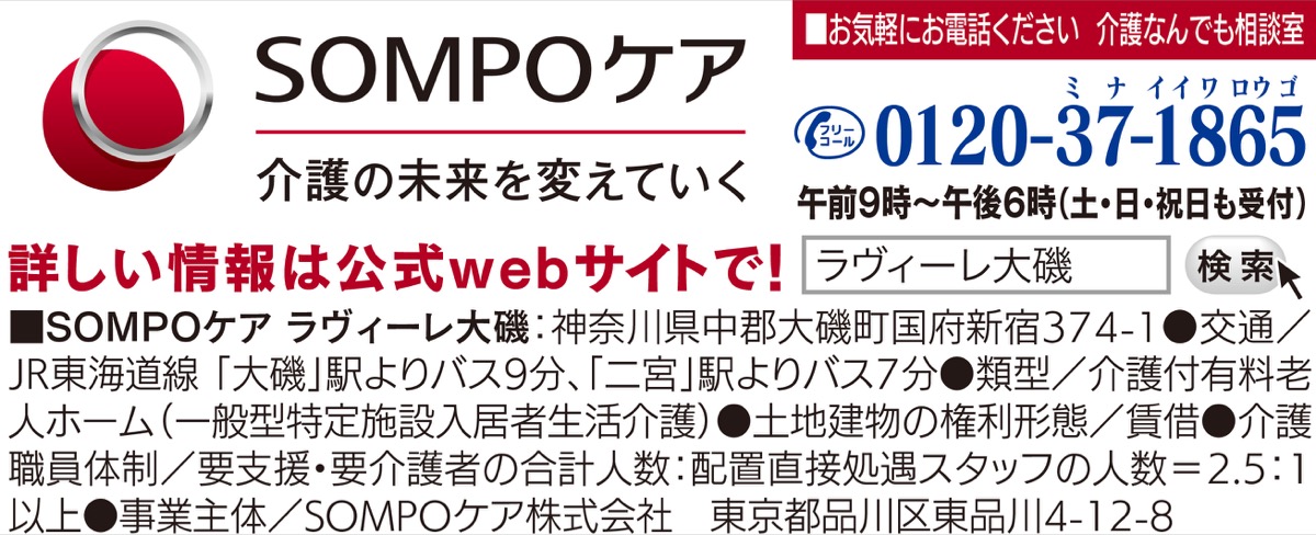 「SOMPOケア ラヴィーレ大磯」は、まるでホテルのような高級感が漂うホーム。落ち着いた雰囲気のカフェや広々としたダイニングやお洒落な中庭など、共有スペースが充実しており、日常的にゆとりと癒しを実感できる。伊藤ホーム長をはじめとしたベテランのスタッフと若いスタッフが協力し合いホームを支えている。また、スタッフの半数が介護福祉士の有資格者な点も心強い。全居室には睡眠センサーを装備し睡眠中の健康チェックもできる。ホーム内で調理する美味しい食事は、栄養面や食べやすさはもちろん、こだわりの食材を用いた多彩な行事食も魅力。アクティビティのメニューも充実している。ショートステイの利用も可能。現在、試食付「無料介護相談会」を開催している(1日1組限定)。ホームの詳細や雰囲気を体験したい人は連絡を。