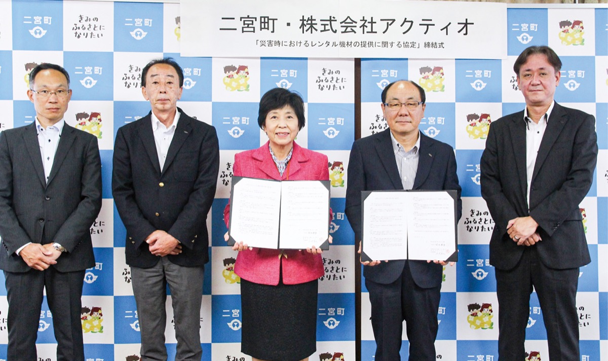今年、関東大震災から100年を迎えることから5月23日、二宮町は更なる防災力強化を図ることを目的に、建設資機材レンタル事業者の株式会社アクティオ(小沼直人代表取締役社長)と災害時の協定を締結した。