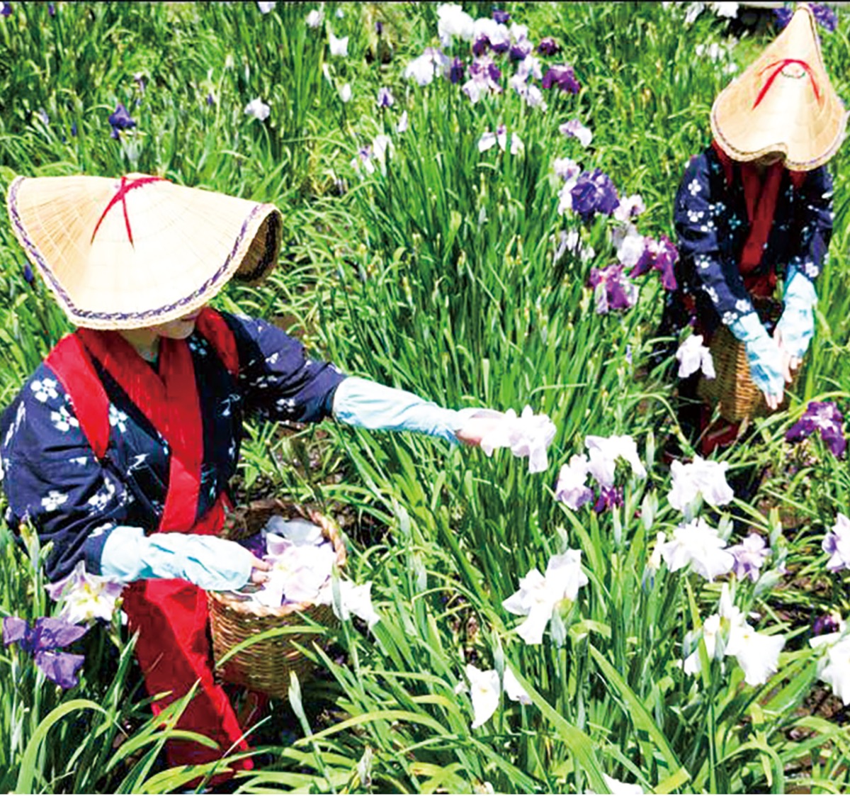 約1万株のハナショウブを誇る二宮町のせせらぎ公園で6月7日、早乙女姿の産業能率大学の学生による花がら摘みが行われた。