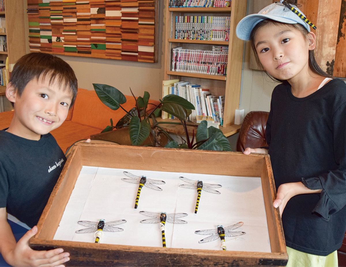 二人がオニヤンマを制作したのは昨年夏。山間にある自宅で、ハチやアブが家の中に入ってくるのを阻止する方法として天敵のオニヤンマの模型を自作し、ベランダやパラソルなどにぶら下げてみた。楸さんは、「ハチが怖くてつけた。かなり減ったと思う」と効果を実感したという。