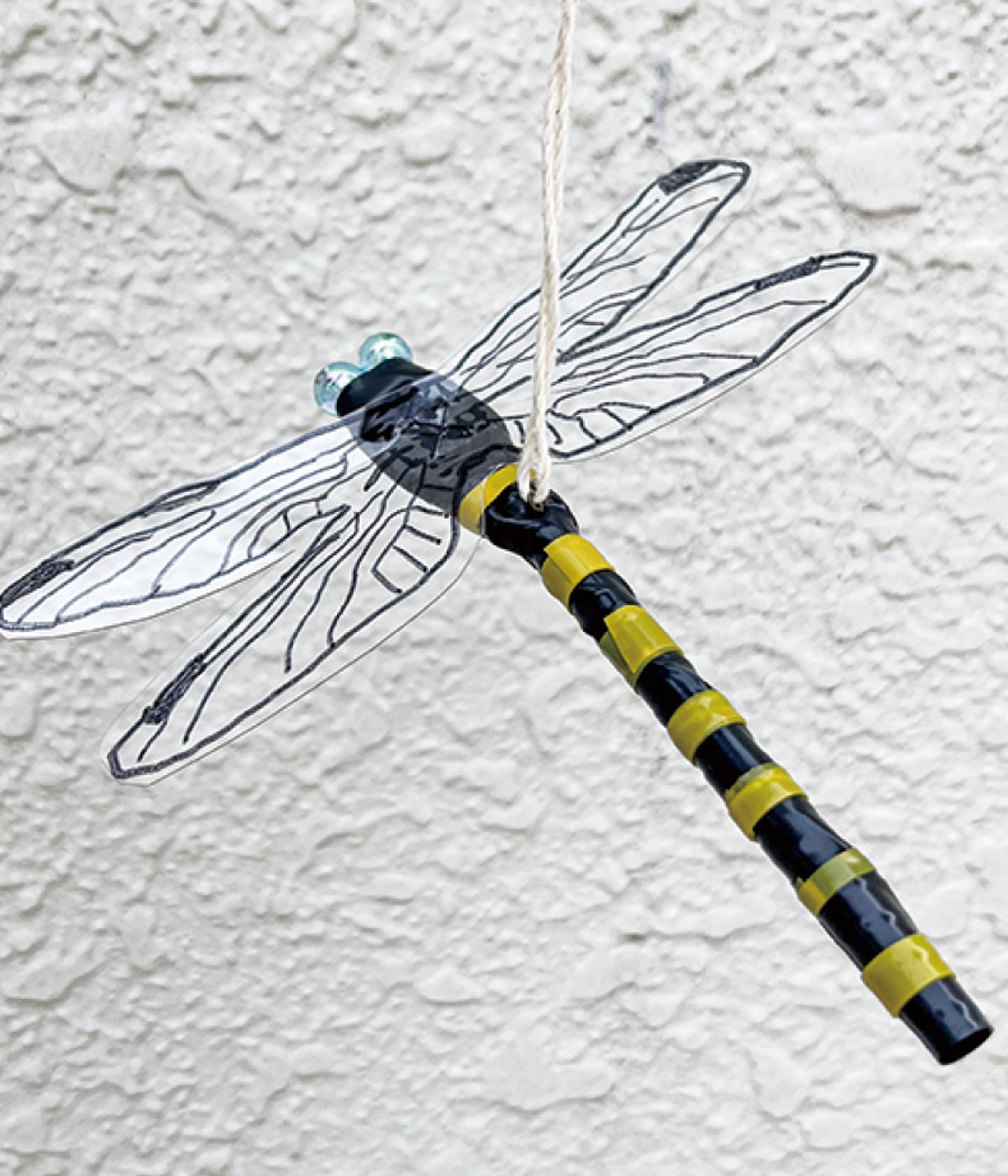 オニヤンマは黒いストローの身体に、黄色いカラーテープを巻きオニヤンマの特徴でもある模様を再現。マジックで1枚ずつ模様をつけた羽根と青いビーズをTピンで固定した目玉は、手作り感がありながらも本物と見間違える出来栄えだ。