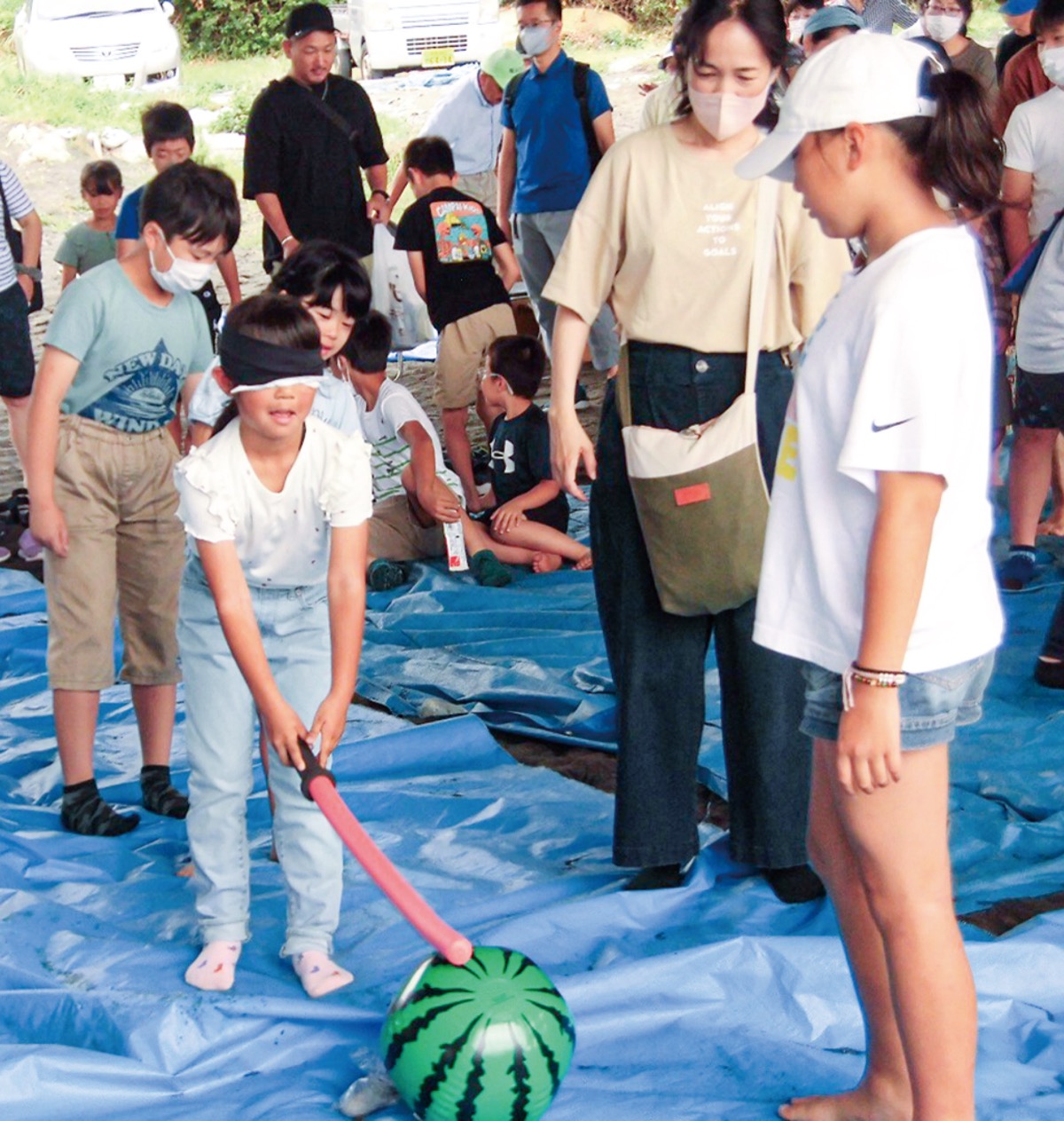 荒天のため、地引網を中止しビーチボールのスイカ割りゲームに変更された同大会。はじめてスイカ割りを体験した子どもの姿も見え、それぞれの参加者は大いに楽しんでいた。他にはジェスチャーゲームやビンゴ大会も実施。会場は盛り上がった。