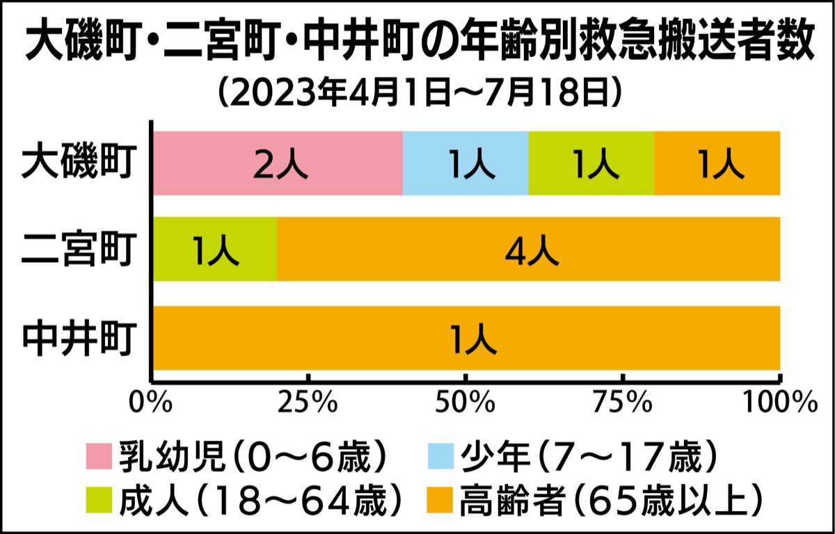 7月18日時点の熱中症による救急搬送者数は大磯町が5人(昨年同時期は10人)、二宮町が5人(同4人)、中井町が1人(同5人)で、大磯町と中井町では昨年より減少傾向。3町を合計した11人の内訳は、男性7人・女性4人、世代別では65歳以上の高齢者が半数を超えた。症状の程度別では重症2人、中等症3人、軽症6人で死者は出ていない。