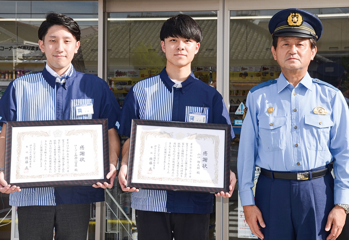 特殊詐欺被害を防止したとして8月31日、ローソン西湘二宮店(土屋雄基店長)と従業員の山口翔太郎さんに大磯警察署(佐藤真署長)から感謝状が贈られた。