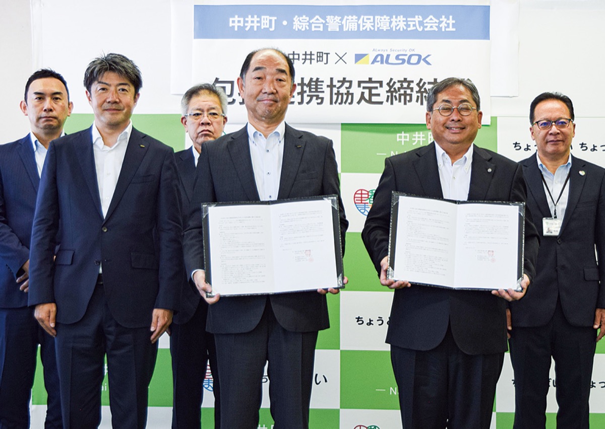 中井町は9月1日、綜合警備保障(株)(ALSOK)と「地域活性化及び町民サービスの向上を図る包括連携協定」を締結した。同社代表取締役グループCOO社長執行役員の栢木伊久二氏らが中井町役場を訪れ、協定書を交換した。