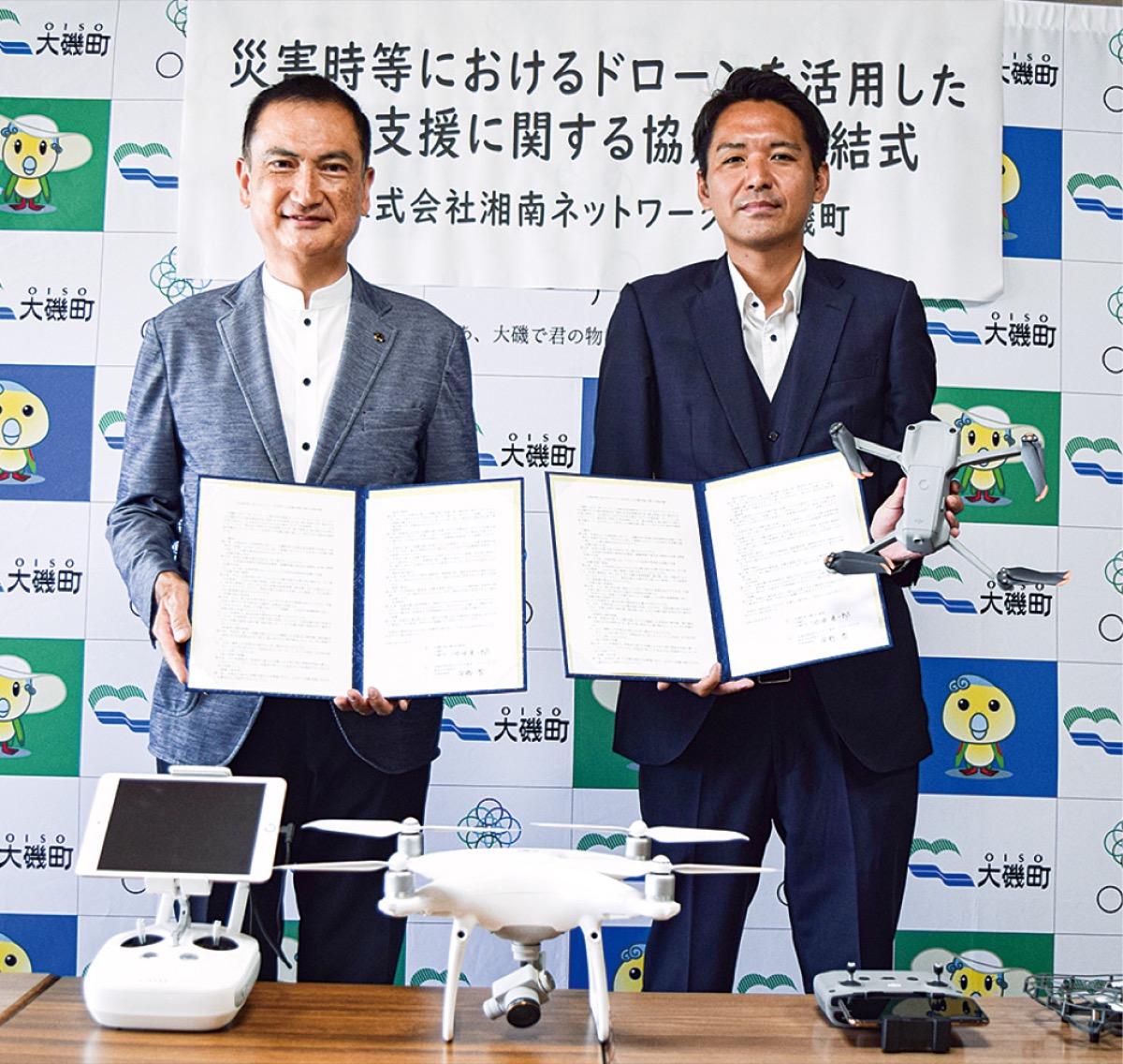 大磯町は9月26日、株式会社湘南ネットワーク(安藤晋代表取締役、本社・平塚市)と「災害時におけるドローンを活用した活動支援に関する協定書」を締結した。災害発生時に、同社が所有するドローンと操作するパイロットが大磯町に派遣される。