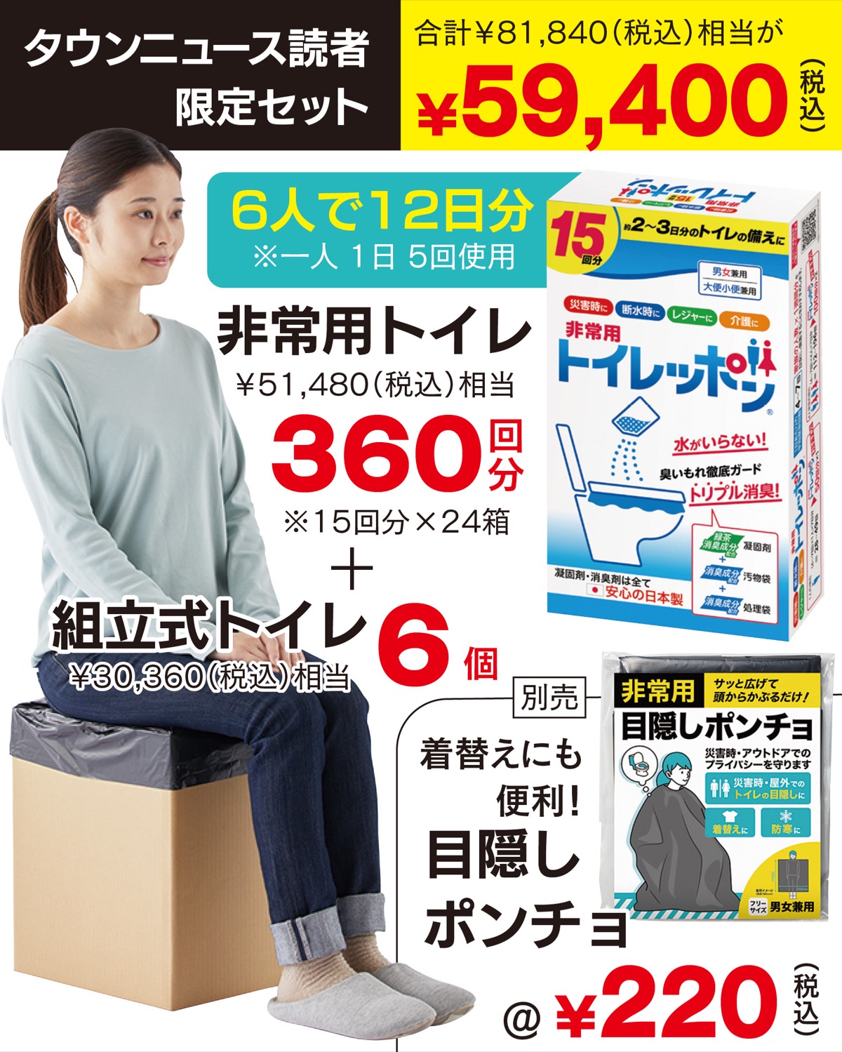 タウンニュース社では非常用のトイレセットを扱っている。中身は、組立てが簡単な耐荷重500kgの段ボール製の簡易トイレ6個と、360回分の汚物袋と凝固剤などが一式となっている。