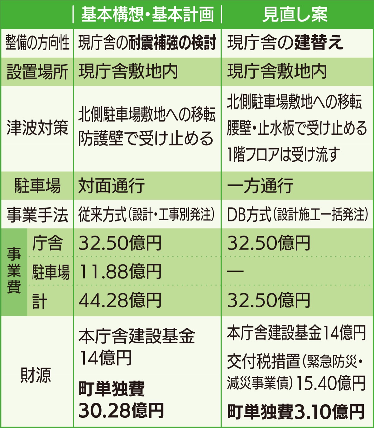 今回公表された見直し案では、整備の方向性について「現庁舎の耐震補強の検討」としていたものを「現庁舎の建替え」とし、事業費の財源については、本庁舎建設基金のほか、25年度までの時限措置となっている国の緊急防災・減災事業債などを活用するとした。町の単独費は3・10億円。2025年度完成予定。