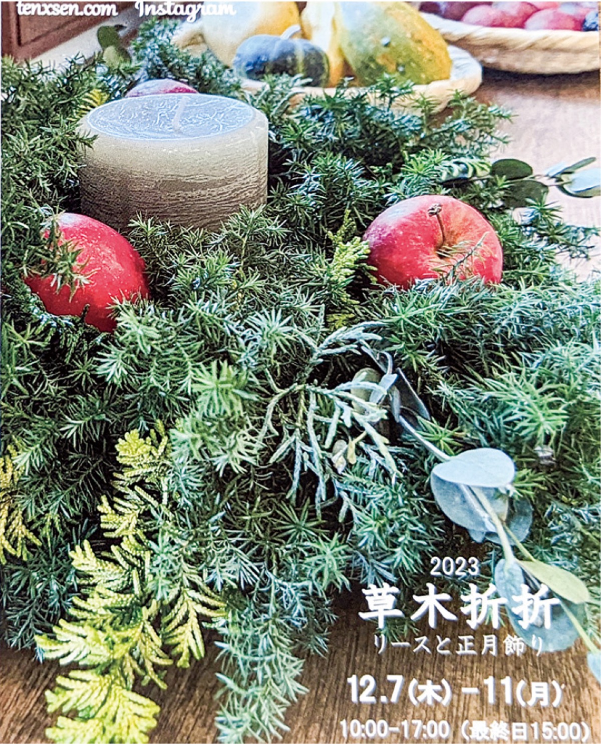 町内で栄養学や四季の花の教室を開いている「てんとせん」による展示。会期中毎日午前11時と午後2時にリースワークショップも開催。各先着5人。参加費千円。