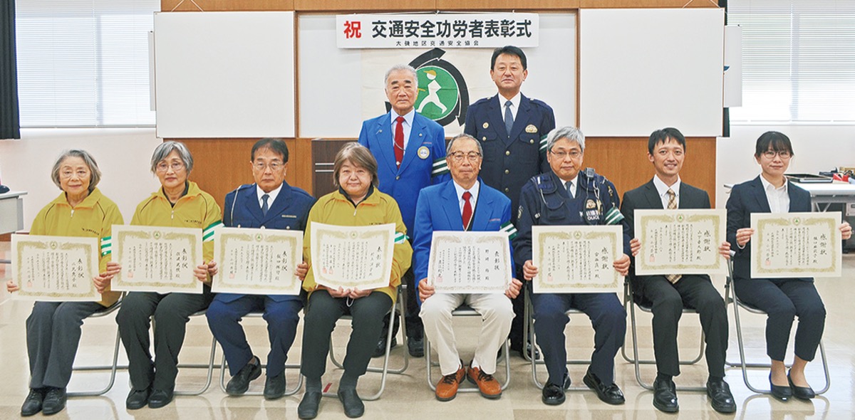 受賞者は以下の通り(敬称略)。▽神奈川県警察本部長表彰/野崎裕▽大磯警察署長・大磯地区交通安全協会長連名表彰/村上洋子▽大磯地区交通安全協会長表彰/飯田修司、佐渡民枝、二見惠子▽同感謝状/山下幸太郎、宮谷真一、樋口麻衣子