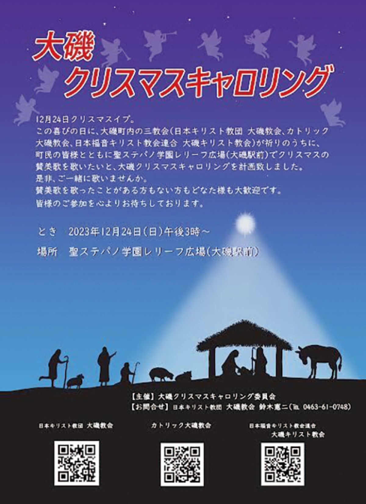 日本キリスト教団大磯教会、カトリック大磯教会、日本福音キリスト教会連合大磯キリスト教会が参加し、クリスマスの賛美歌を歌う。「賛美歌を歌ったことがある方もない方も大歓迎です」と同委員会。