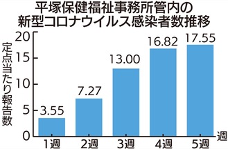平塚保健福祉事務所管内(平塚市、大磯・二宮町)11カ所の定点医療機関で報告された新型コロナの感染者数が、2月4日までの1週間で193人に上った。定点当たりの患者報告数は「17・55」となり、前週の「16・82」から増加。今年に入ってから5週連続で増えている。
