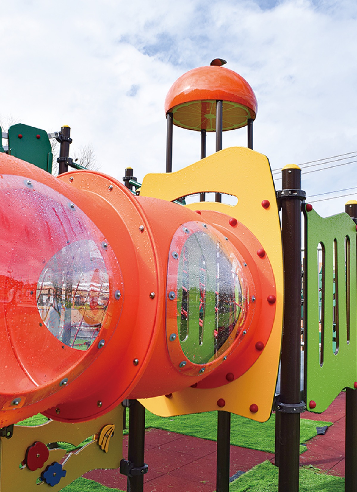 ジュースやラーメンなどの加工品が「里都まちなかいブランド」にもなっているみかんをモチーフにしているのが特徴。オレンジや黄色、緑などのみかんを彷彿とさせるカラーリングに加え、遊具の中にはみかんを模した屋根「みかんルーフ」、車いす利用者も使いやすい高さに設定され誰もが安全に楽しめる「みかんポリン」が設置されている。