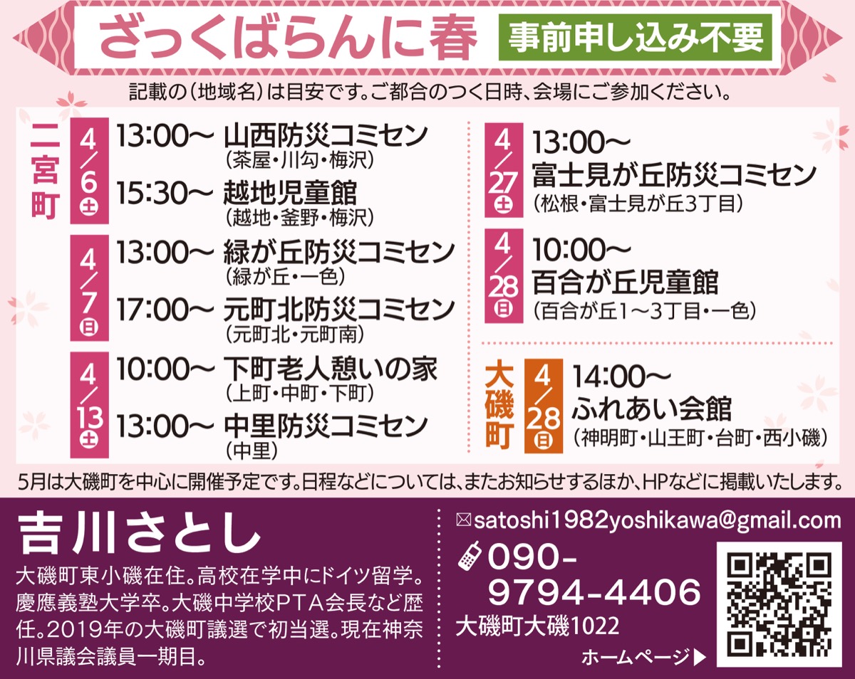 県予算の概要について、また地元の大磯町や二宮町に関連する予算につきましては、4月6日(土)から5月12日(日)までに両町17か所で開催する、吉川さとし県政報告会”ざっくばらんに春”でご報告させていただきます。ぜひご出席ください。