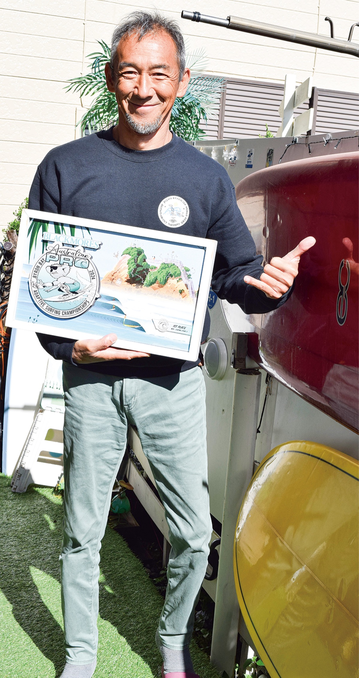 大磯町東町在住の勝倉直道さん(60)が、3月17日から22日までオーストラリア・バイロンベイで開催された障害者サーファーの国際大会「ブラックモアズ・オーストラリアン・プロ・アダプティブ・サーフィン・チャンピオンシップ」のスタンド3の階級で優勝した。勝倉さんは「念願の金メダル。仲間におめでとうと言われた時には、思わず涙ぐんでしまった」と笑顔を見せる。
