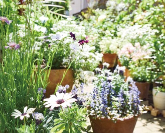 4月19日から始まった前期日程では、クリスマスローズのほかオステオスペルマムが見頃を迎えていた岩田さん宅。後期には約40鉢のバラが見頃を迎えるという。その他、ジキタリスやフランネルフラワーなど、岩田さんがお気に入りだと話す品種も並んでいた。