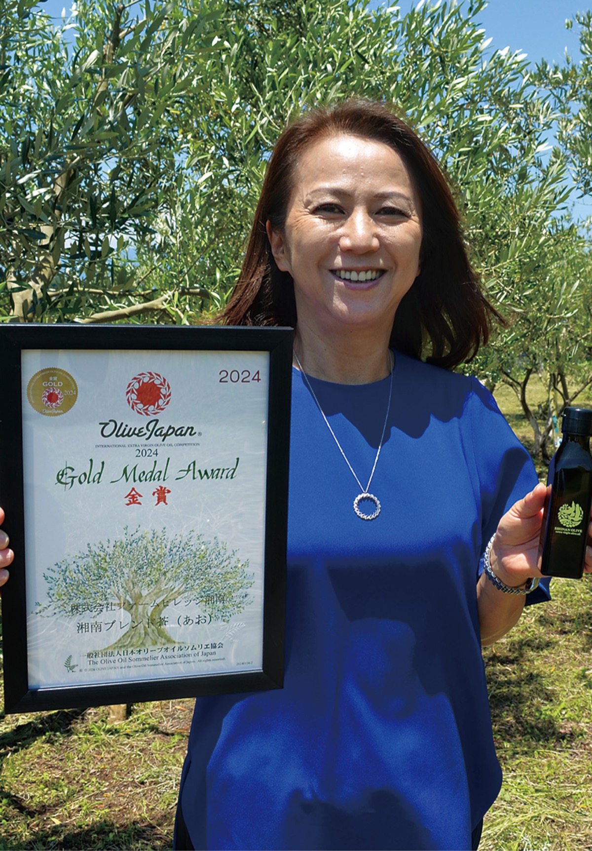 ファームビレッジ湘南(眞壁弘一代表取締役)が出品したオリーブオイルが6月10日、「OLIVE JAPAN2024国際オリーブオイルコンテスト」で金賞2つ、銀賞3つを受賞した。
