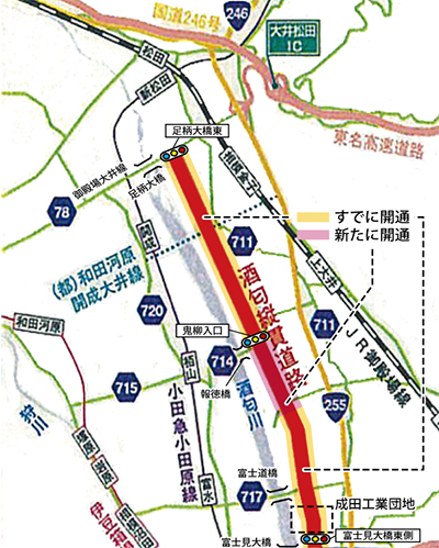 供用が開始されれば小田原市国府津の「富士見橋際」交差点から同市蓮正寺のヤオマサ蛍田店までの約5・6Kmが直結。川西〜川東間の交通の利便性が高まるとともに、巡礼街道の渋滞緩和が期待される。