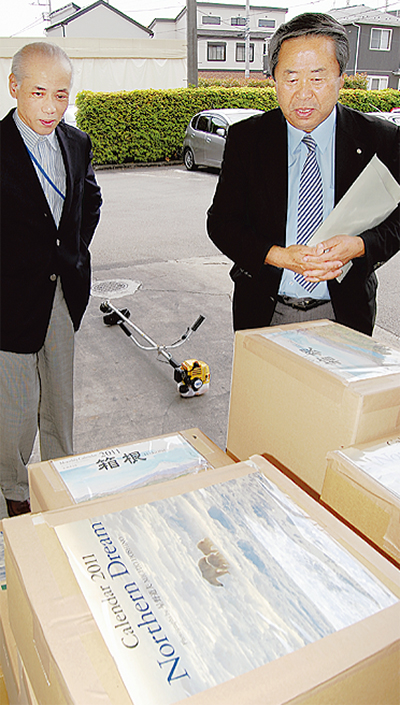 東日本大震災の被災地を継続的に支援している小田原ライオンズクラブ(松下民雄会長)は21日、文化堂印刷株式会社(萩野健治社長)から約1000部のカレンダーを受け取った。市民や小田原報徳ライオンズクラブの協力で購入した支援物資とともに6月上旬までに被災地へ届ける。