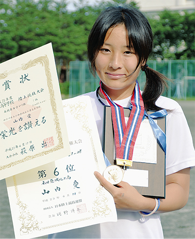 山内さんは埼玉で6月10日〜12日に行われた『第95回日本陸上競技選手権大会』にやり投げで出場。51m05で6位に入賞した。「社会人が一緒の大会の投てき種目で、高校生の入賞は今までなかったのでは」と陸上部顧問の鈴木充教諭は成長に目を丸くする。