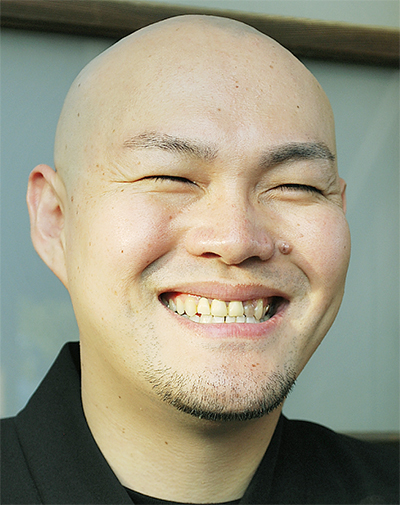 ○…坊主頭に人懐っこい笑顔は自画像通り。人の懐に入っていけるさりげないやさしさが、作品に独特の温かみを与えている、と感じさせる。書画家として今や活躍は国内に限らない。スケジュールも年内はいっぱいだ。常に「100%良いものを作ろうと思って仕事をしている」。そんな想いは作品からも屈託のない笑顔からも伝わってくる。