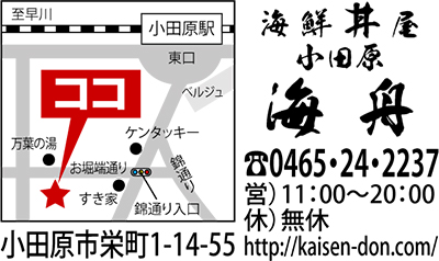 「小田原で旨い魚が食べられる店はどこ?」。そう聞かれて即答できない市民も多いのでは?だがついに地元・相模湾の海の幸を豪快に味わえる丼専門店「海舟」が9月7日(水)、お堀端通り万葉の湯前にオープンする。同店は早川港の仲卸問屋直営。鮮魚に精通する目利きの達人プロデュースだから、朝獲れ新鮮な魚介が堪能できる。40種もの丼は780円〜。あら汁無料サービスでおかわり自由。「これぞ小田原」という味に舌鼓を打ってほしい。