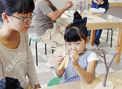 市内から参加したという江藤妃那乃(ひなの)ちゃん(5歳)は、お母さんとの制作作業に「楽しい」と笑顔を見せていた。